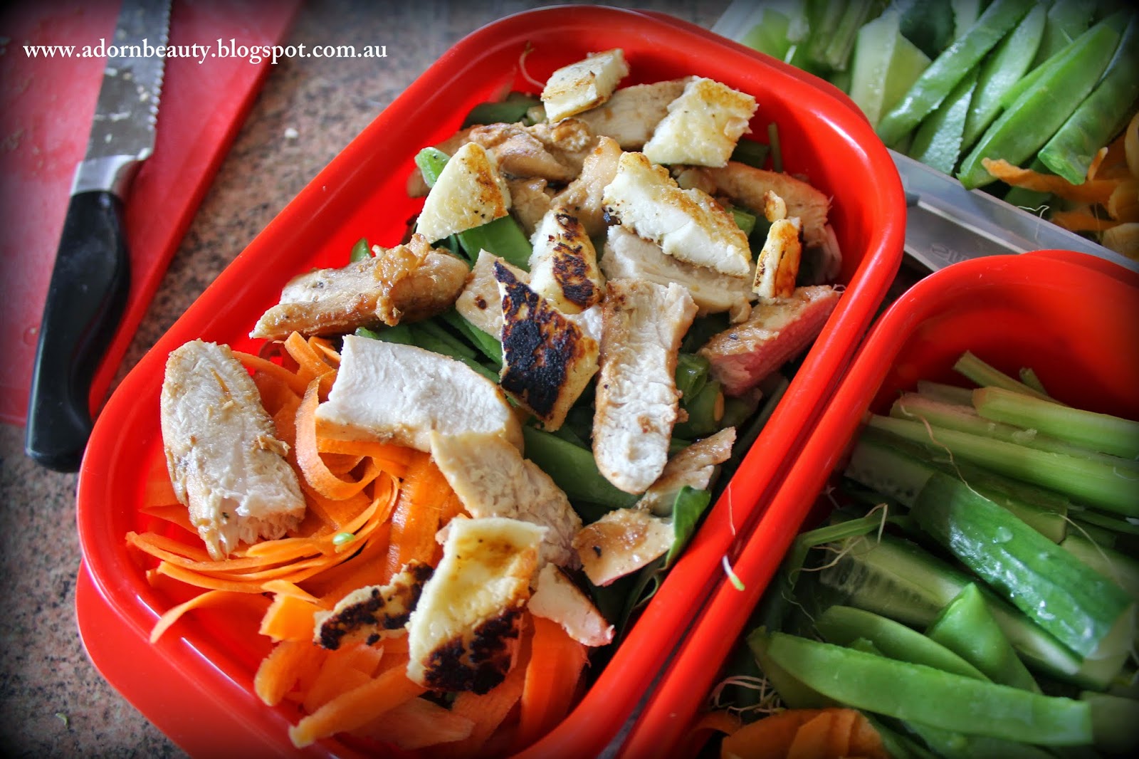 I have cut up all the other chicken pieces and halloumi and wrapped them individually in some cling wrap for each day so that they won't go off or make the salad soggy!